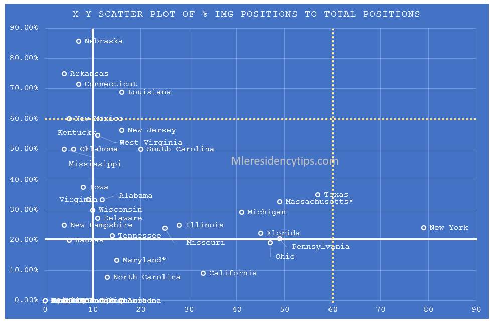 From our previous list all 11 of these fall in these 2 quadrants. With New York and Pennsylvania in the top right quadrant. This suggests that these states have higher number of positions and IMGs matching.