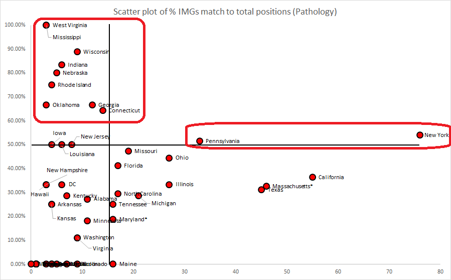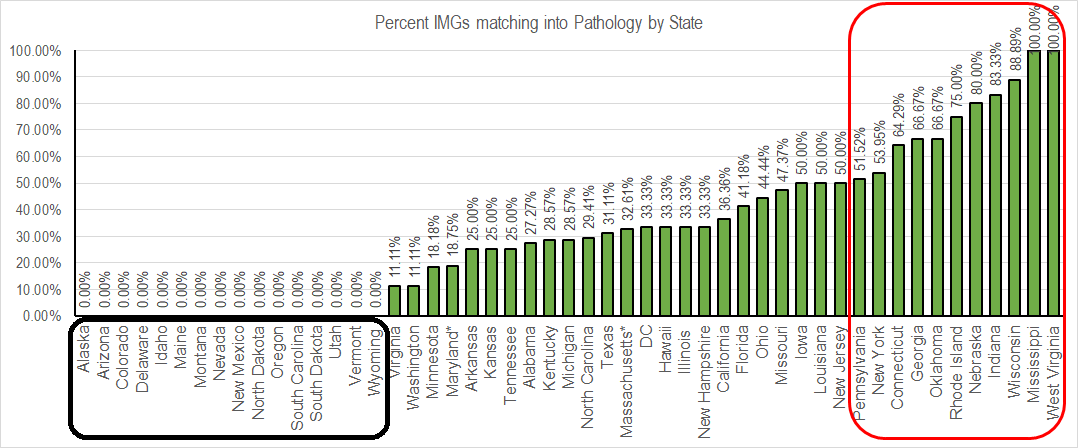 Thus, IMG applicants interested in pathology should consider these 11 states as priority. Special emphasis on New York and Pennsylvania for their high number of total positions and percent IMGs matching